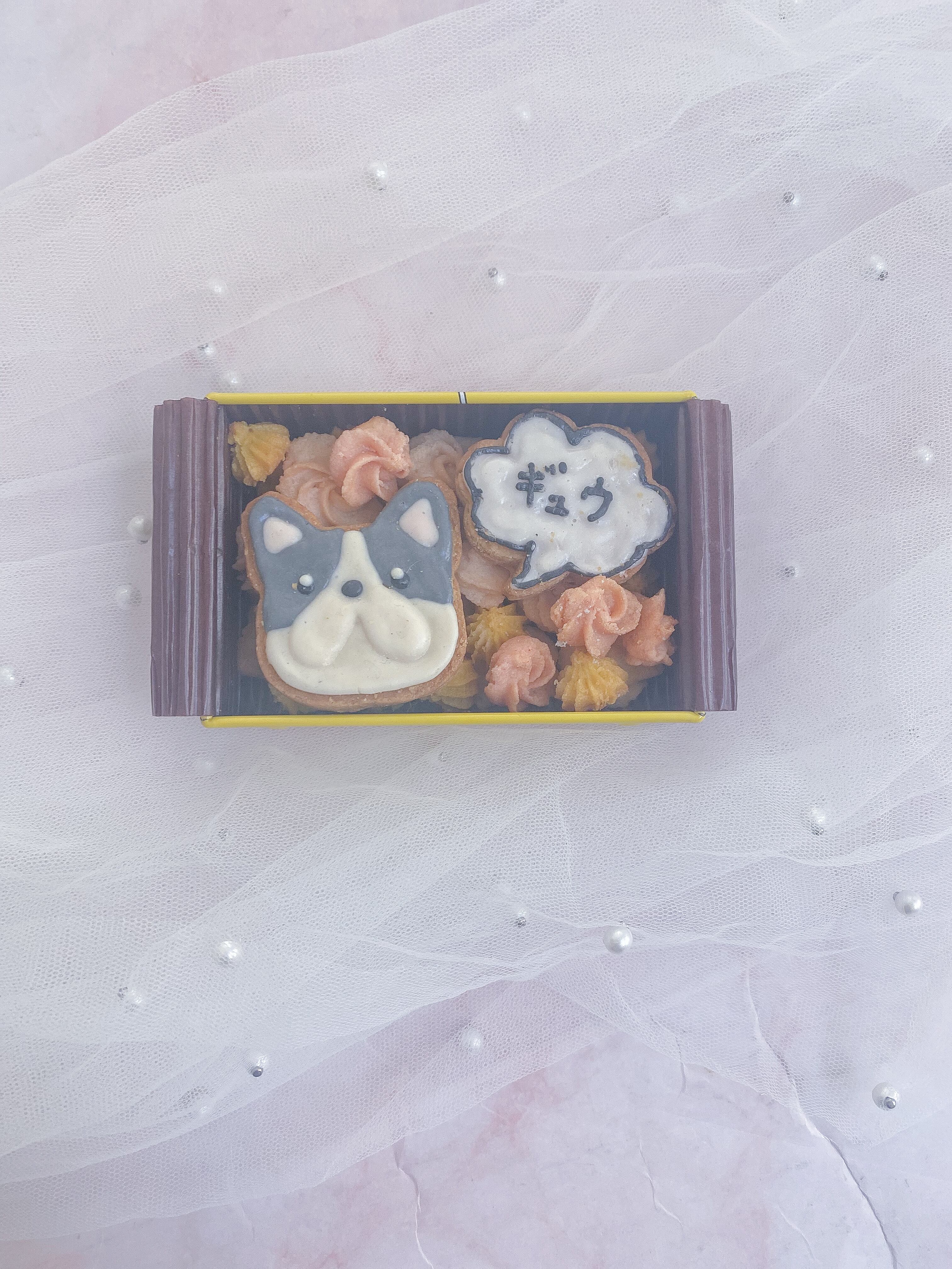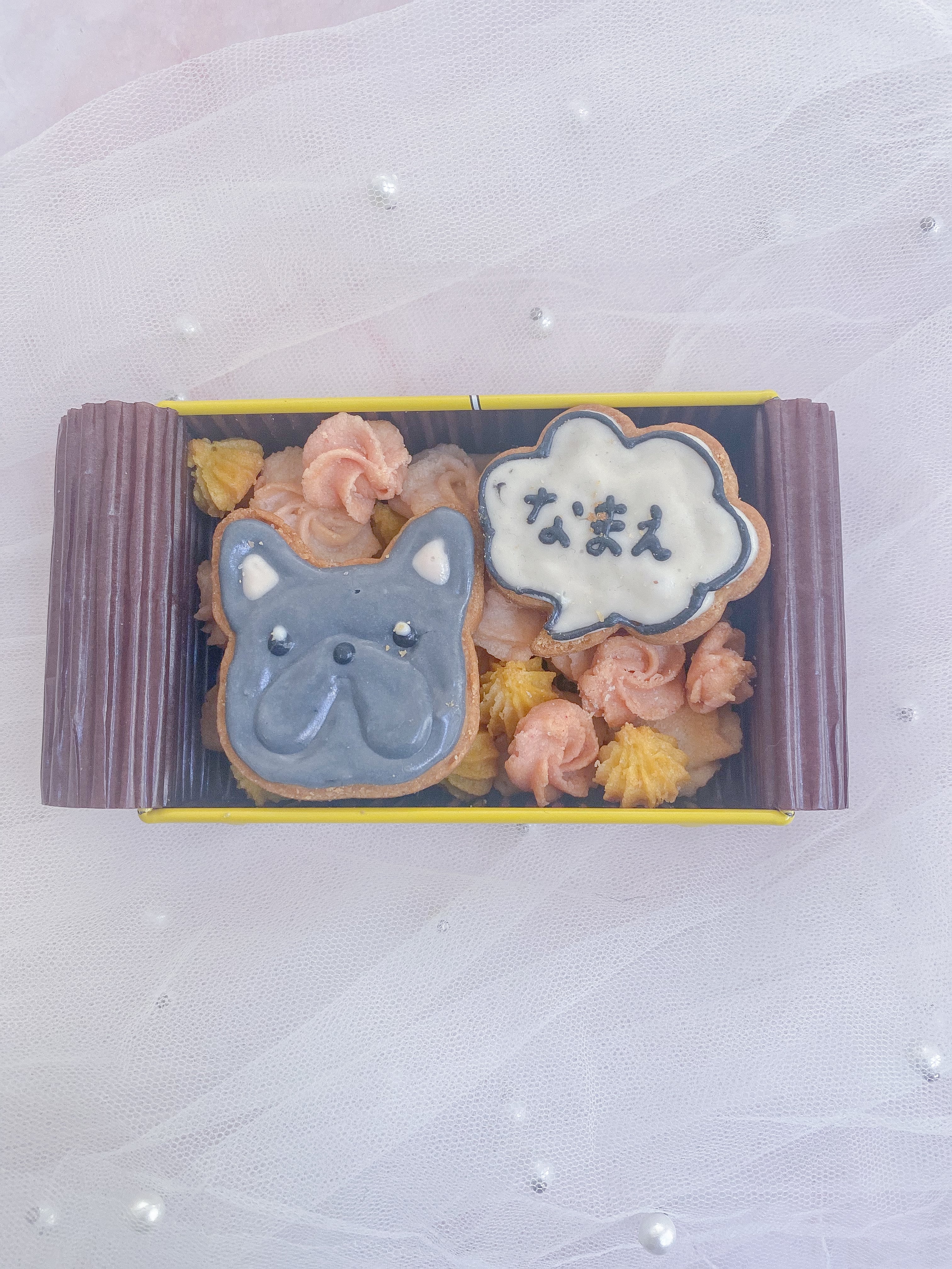 ふたを開けると、色とりどりの吹き寄せクッキーが宝石のように詰まっており、中心にはうちの子のアイシングクッキーとお名前入りクッキーが輝きます